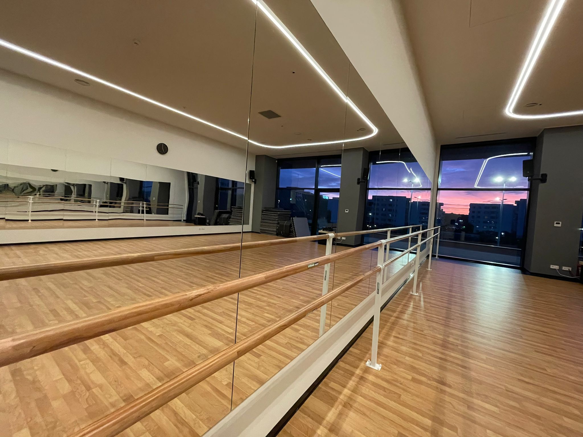 Bara balet dubla este compusa din 3 suporti metalici cu prindere in podea, si 2 bare din lemn de fag cu lungimea de 2.5 m fiecare.
