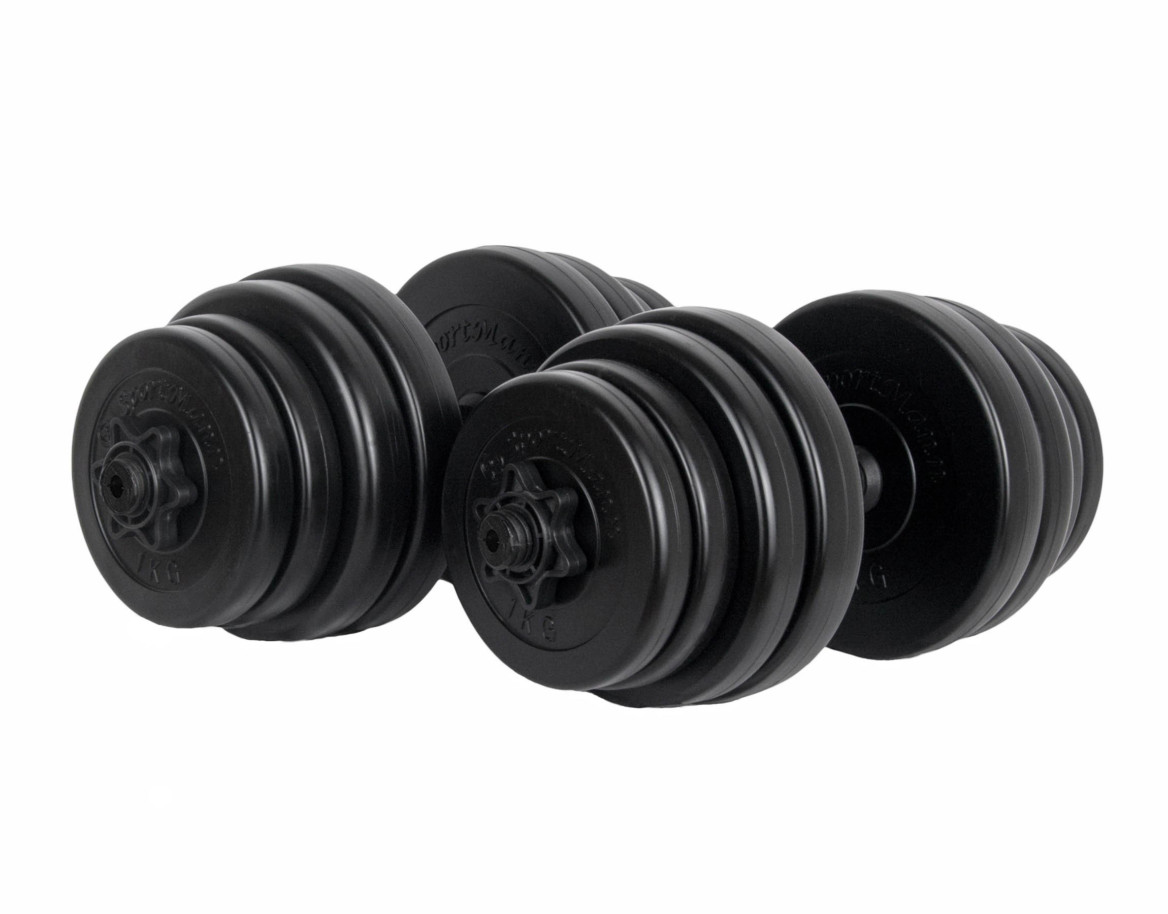 Setul de gantere 2×15 kg de la Sportmann contine: 4 discuri de 2,5 kg, 4 discuri de 2 kg, 4 discuri de 1,5 kg, 4 discuri de 1kg, 2 bare si 4 sigurante. Discurile sunt fabricate din PVC rezistent la uzura si sunt umplute cu ciment. Barele sunt prevazute cu manere aderente pentru stabilitate inalta in timpul exercitiilor. Sigurantele cu filet sunt usor de utilizat si impiedica alunecarea discurilor de pe bara. Ganterele PVC cu ciment 2x15kg sunt potrivite pentru antrenarea eficienta a musculaturii superioare a corpului acasa sau la sala.