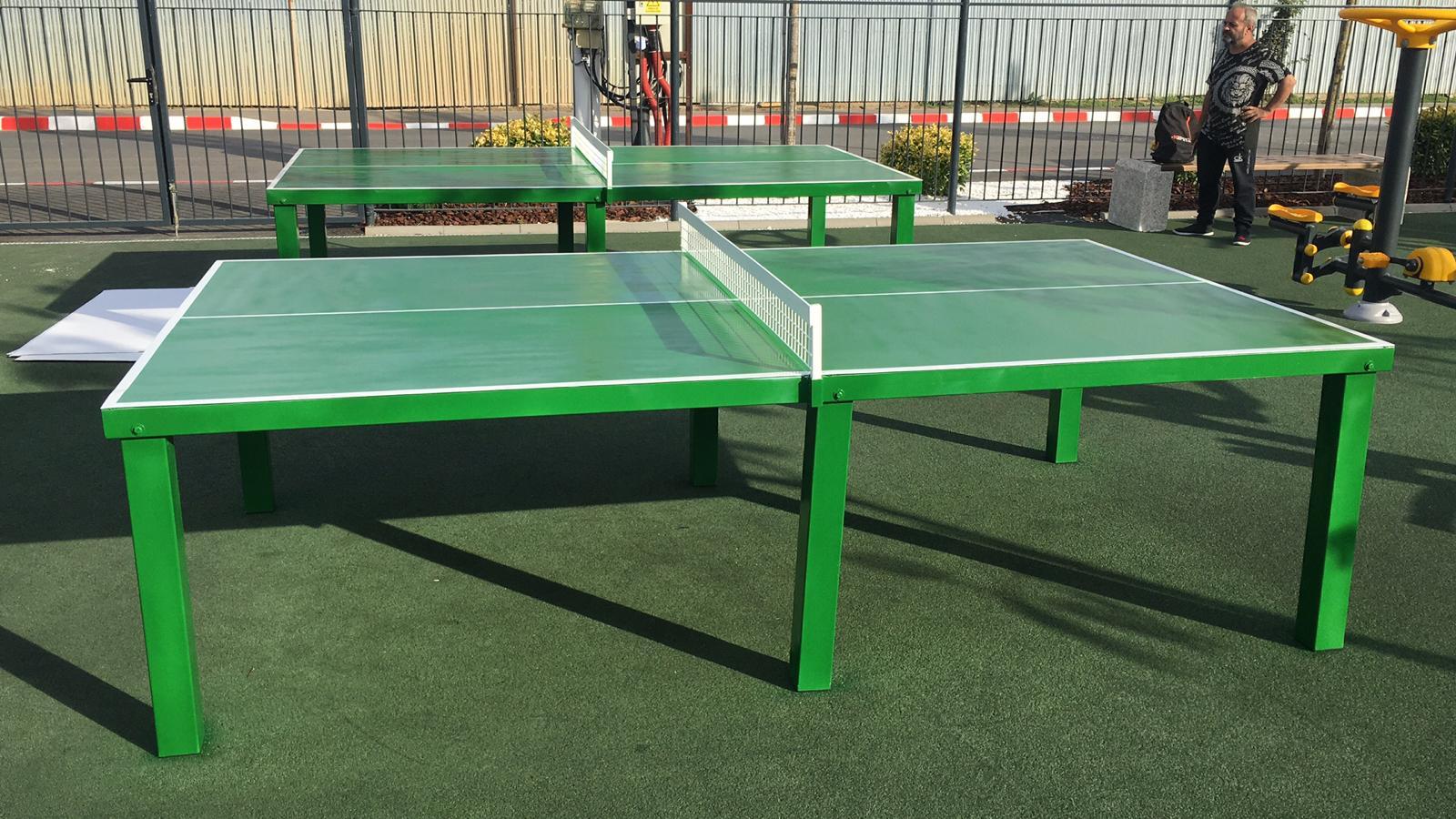 Suprafata de joc este realizata din tabla cu grosimea de 3 mm culoare albastru sau verde, fixate pe structura de sustinere a mesei. Picioarele mesei sunt realizate din profil de otel rectangular cu dimensiunea 80 x 80 x 3 mm, vopsite in camp electrostatic. Masa de tenis se fixeaza pe suprafata de joc cu ajutorul gaurilor din talpi.