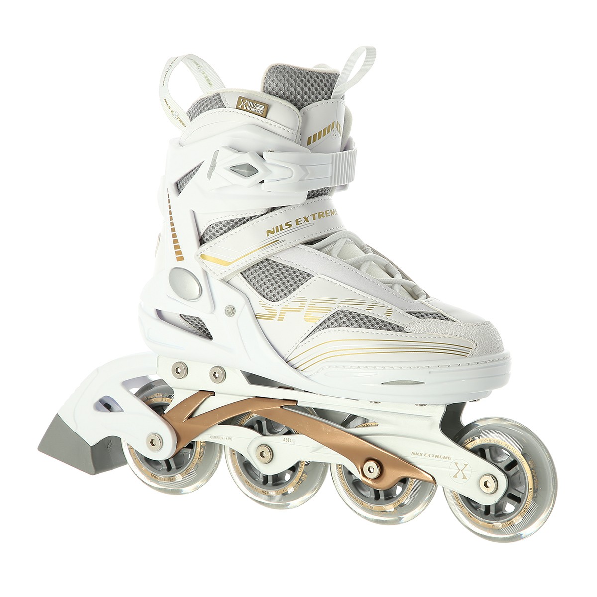 Role Nils Extreme NA2150 Alb sunt destinate patinatorilor intermediari si avansati pentru patinaj recreational. Aspectul lor atractiv este rezultatul nu numai al unui design interesant, ci mai ales al utilizarii unor materiale de calitate. Pantoful usor si durabil garanteaza siguranta in timpul merslui. Sistemul de ventilatie folosit pentru pantofi si talpa moale EVA cresc direct confortul utilizatorului. Patinele cu role in linie au roti de 80 mm care va permit sa atingeti viteze mari. La randul sau, mersul lin este asigurat de rulmentii ABEC9. Acest model este, de asemenea, echipat cu o sina speciala din aluminiu si o prindere cu catarama, curea cu velcro si siret.