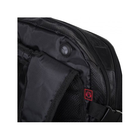 • În primul rând, un laptop de 17” se poate păstra și proteja fixâdu-l cu o închidere Velcr.o Plus un buzunar ascuns specific MP3 player cu o deschidere pentru căști pentru a asculta muzică în drum către sala de sport.