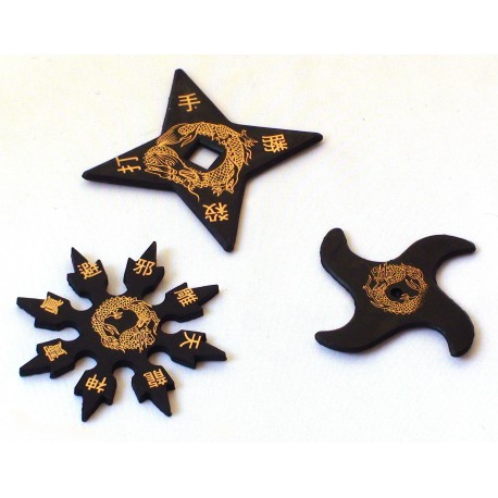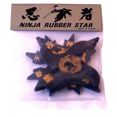 Set steluțe ninja – cauciuc. Acest set este format din trei steluțe de cauciuc cu diferite forme. Sunt confecționate din cauciuc semirigid pentru a conferi un grad de siguranță în utilizare în comparație cu steluțele ninja din metal. Pentru o protecție sporită vă sfătuim să utilizți ochelari sau cască de protecție.